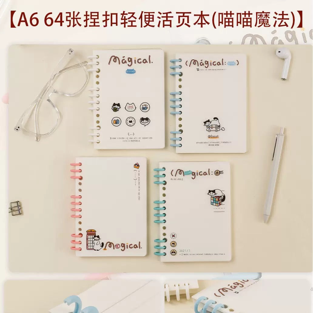The product is a spiral-bound pocket notebook featuring a "Magical" self-love theme with a cute cartoon kitten design.ruled